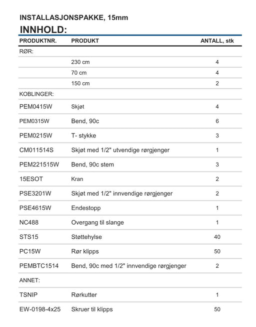 Se alle detaljerEco installasjonspakke 15mm rør og koblinger