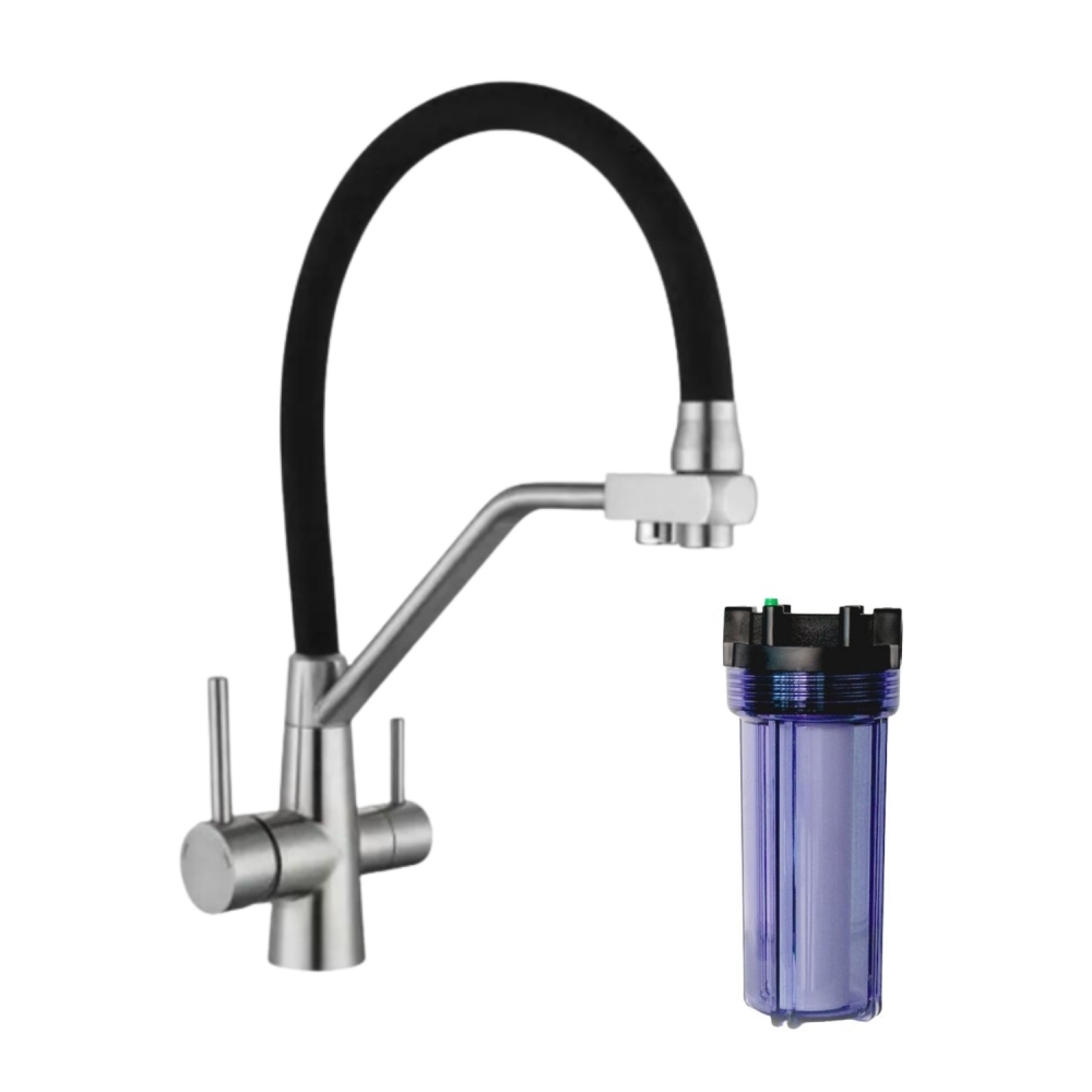 Eco Queen er en elegant treveis kjøkkenkran med 2 grep, ett til kaldt og varmt vann og ett til renset filtrert drikkevann. Kranen er laget i chrome/rustfritt stål med en bevegelig sort slange, og er ideel for hytta, hjemmet eller kontoret der du ikke ønsker en separat kran for renset vann. Eco Queen kjøkkenkran kobles til vannfilteret montert i benkeskapet under vasken.