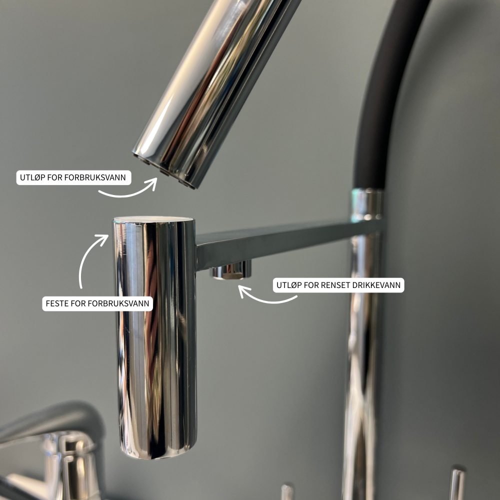 Den bevegelige slangen sørger for at forbruksvannet kan nå alle kriker og kroker som vanlige kraner ikke kan nå. Et eget grep gir deg filtrert drikkevann via dedikert utløp, skjult på undersiden av stangen som holder den bevegelige slangen for forbruksvannet. Den andre spaken regulerer varmt/kaldt forbruksvann.