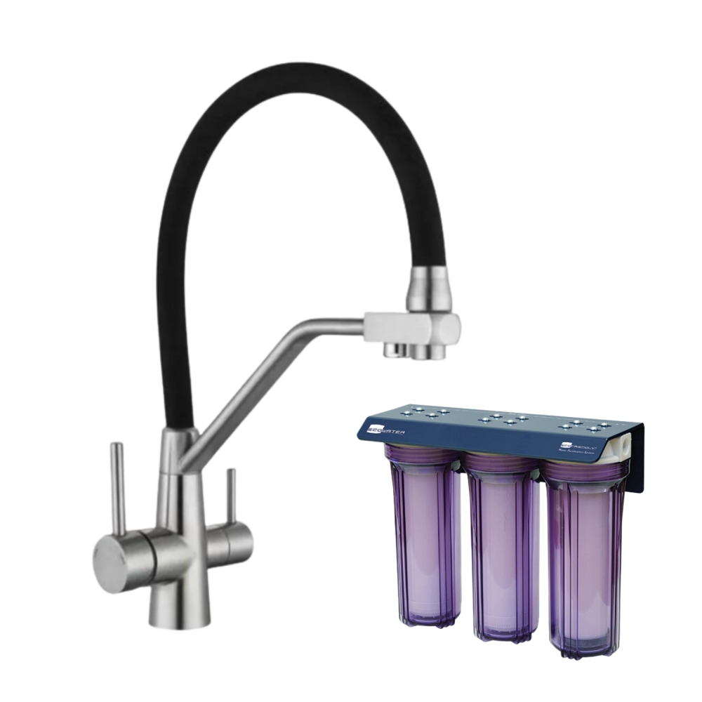 Komplett pakke med det du trenger for oppkobling og tapping av trygt drikkevann hjemme og på hytta til en rimeligere pris enn ved kjøp av produktene hver for seg. Eco Friendly Plus har et grovfilter i front og passer der du sliter med partikler i vannet. Denne pakken leveres med Eco Queen treveis kjøkkenkran i blank chrome/rustfritt stål og en sort bevegelig slange til forbruksvannet. Kranen gir deg kaldt, varmt og filtrert renset drikkevann fra en og samme kran.