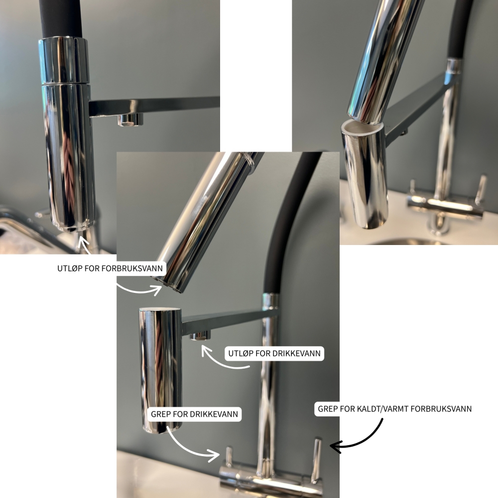 Den bevegelige slangen sørger for at forbruksvannet kan nå alle kriker og kroker som vanlige kraner ikke kan nå. Et eget grep gir deg filtrert drikkevann via dedikert utløp, skjult på undersiden av stangen som holder den bevegelige slangen for forbruksvannet. Den andre spaken regulerer varmt/kaldt forbruksvann.